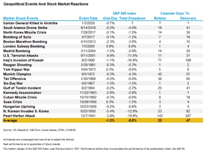 When it comes to the financial markets, there is always something to worry about. Geopolitical events tend to put all investors on edge – some more than others. We have found it beneficial to look back at some of these, hoping to identify how the recent military action in Iran might affect the market. Historically, the S&P 500 has shown resilience in the face of geopolitical events, often experiencing short-term volatility followed by relatively quick recoveries. While market reactions vary based on the severity, scale, and economic impact of the event, long-term investors typically see limited disruption to broader market trends. As is illustrated within the chart below provided by LPL Research, of the 21 events listed, the average total drawdown in the S&P 500 was 5% and the recovery 47 days. Major geopolitical events - such as wars, terrorist attacks, and political crises - often trigger immediate market selloffs as investors emotionally react to the uncertainty by reducing risk. For example, the S&P 500 fell nearly 5% on the day of the September 11 attacks in 2001 but recovered its losses in about one month. Similarly, the Gulf War in 1991 and the invasion of Iraq in 2003 initially rattled markets but were followed by rallies once outcomes became more predictable.